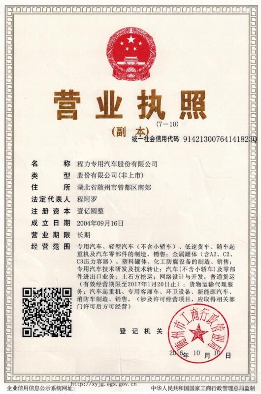 程力專用汽車股份有限公司:2013年3月12日,由湖北程力專用汽車有限公司更改為程力專用汽車股份有限公司,簡稱“程力專汽”。公司注冊(cè)資金為壹億伍仟玖佰萬圓整。公司集研制、開發(fā)、制造、銷售、售后服務(wù)于一體,程力公司已率先全面通過ISO9001-2000國際質(zhì)量體系認(rèn)證,產(chǎn)品全部通過3C國際強(qiáng)制產(chǎn)品認(rèn)證,并通過出口產(chǎn)品的各項(xiàng)認(rèn)證。